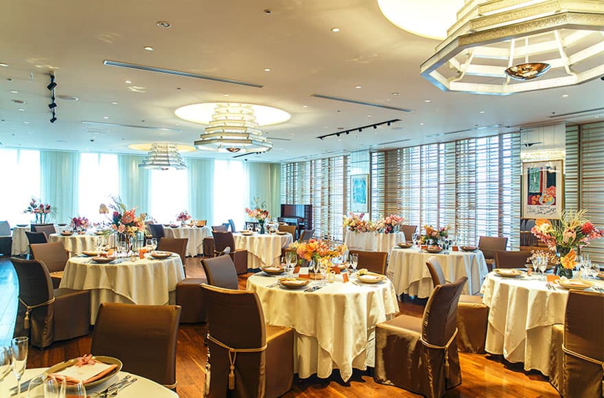 窓から降り注ぐ陽光が明るく開放感のあるパーティサロン。