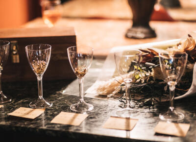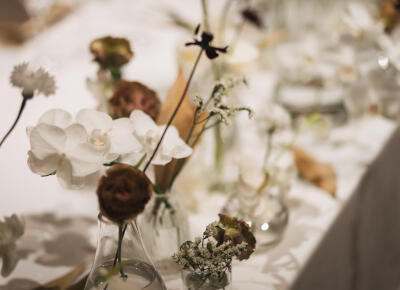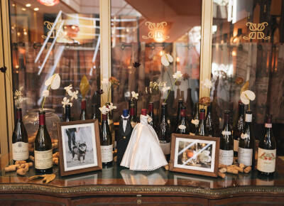 ウェルカムスペースは、二人が出会った年のヴィンテージワインをオリジナルのドレスとタキシードを着せて飾ったり、いままで一緒に飲んだワインのボトルやコルクを置いて、花をいけてもらいました。