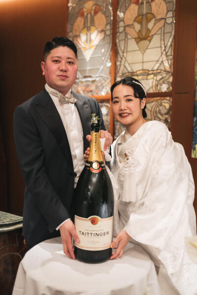 披露宴ではケーキ入刀、ファーストバイトの代わりに、特大のシャンパーニュとグラスを用意し、ゲストに振る舞いました。