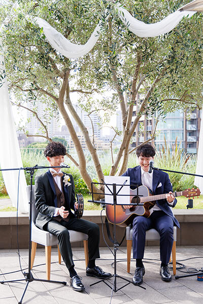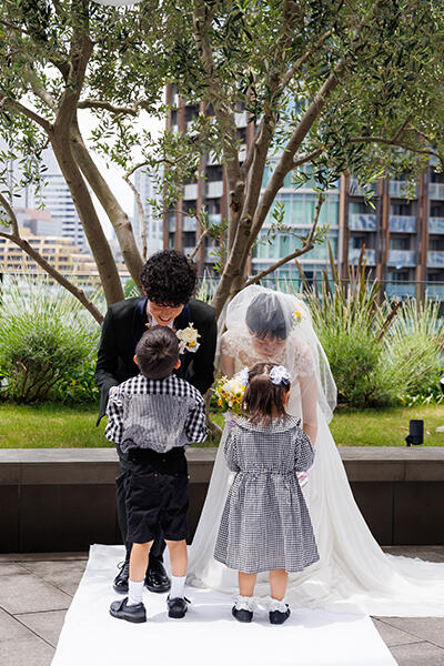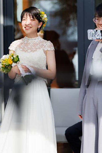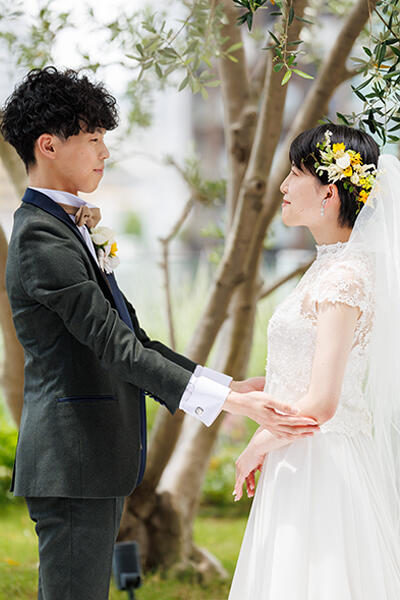 形式ばらず自然体で自分たちらしく誓いを立てたいと選んだ挙式は、テラス人前式。